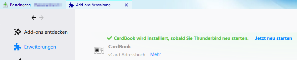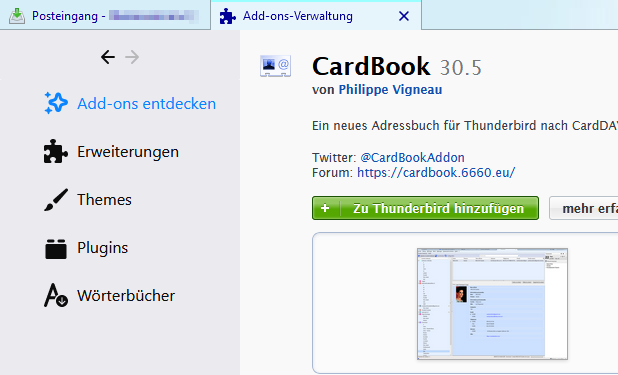 Auch dort dort steht unter CardBook bei mir nur "+ Jetzt Herunterladen" und nicht wie bei dir "Zu Thunderbird hinzufügen"