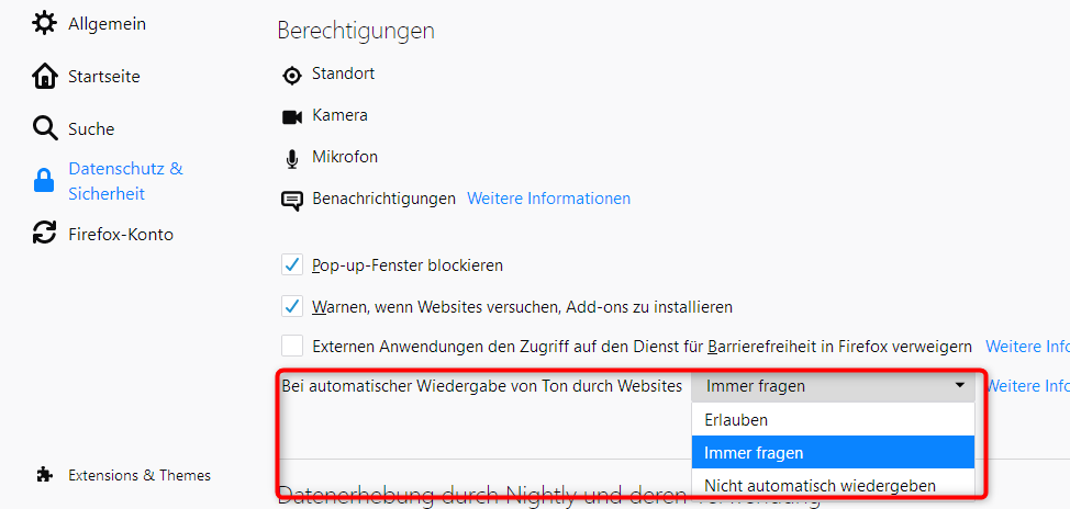 erhält man in den Einstellungen vom Firefox unter Datenschutz & Sicherheit einen neuen Eintrag, womit man die automatische Wiedergabe von Videos jederzeit bearbeiten zu kann.
