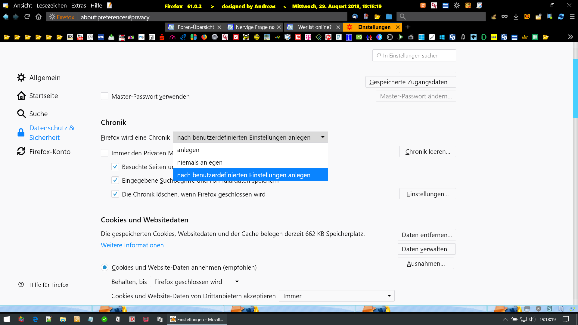 • ich surfe ständig im privaten Modus, will das aber gar nicht. Ich finde keine Einstellung, um diesen Modus zu ändern, auch finde ich keine Einstellungen, um Cookies beim Beenden zu behalten. Die Firefox Hilfe ist da wirklich keine Hilfe.