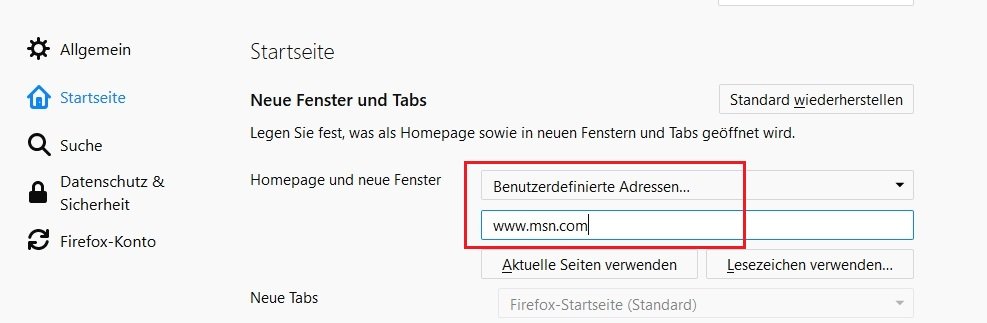 • Ich habe schon zigmal msn.com als Startseite festgelegt und das ADD-on wid auch angezeigt, Trotzdem werde ich mindestens 1* täglich gefragt, ob ich man.com als Startseite festlegen will. Das nervt ungemein, genauso wie übrigens die dauernde Nachfrage, ob ich das Nachrichten Add-on von msn herunterladen will, Ich möchte dass diese ewige Nachfrage endlich aufhört.