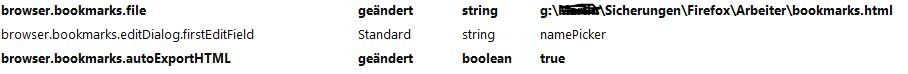 Also das schaut wie auf deinem Screenshot aus - nur anderer Pfad halt, aber natürlich endet das mit der bookmarks.html. Und klar, der Wert ist mal String wo ein String ist und "true" ist Boolean. Klar.
