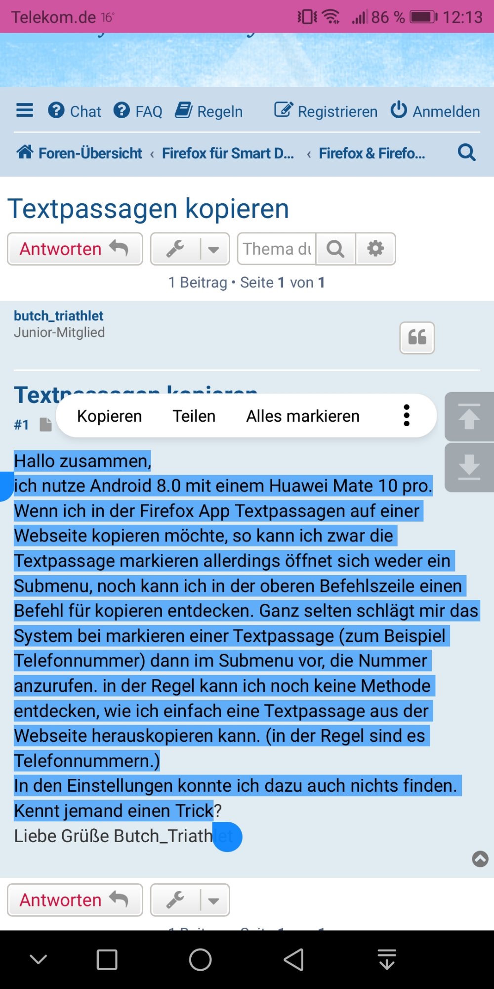 Wenn ich in der Firefox App Textpassagen auf einer Webseite kopieren möchte, so kann ich zwar die Textpassage markieren allerdings öffnet sich weder ein Submenu, noch kann ich in der oberen Befehlszeile einen Befehl für kopieren entdecken. Ganz selten schlägt mir das System bei markieren einer Textpassage (zum Beispiel Telefonnummer) dann im Submenu vor, die Nummer anzurufen. in der Regel kann ich noch keine Methode entdecken, wie ich einfach eine Textpassage aus der Webseite herauskopieren kann. (in der Regel sind es Telefonnummern.)