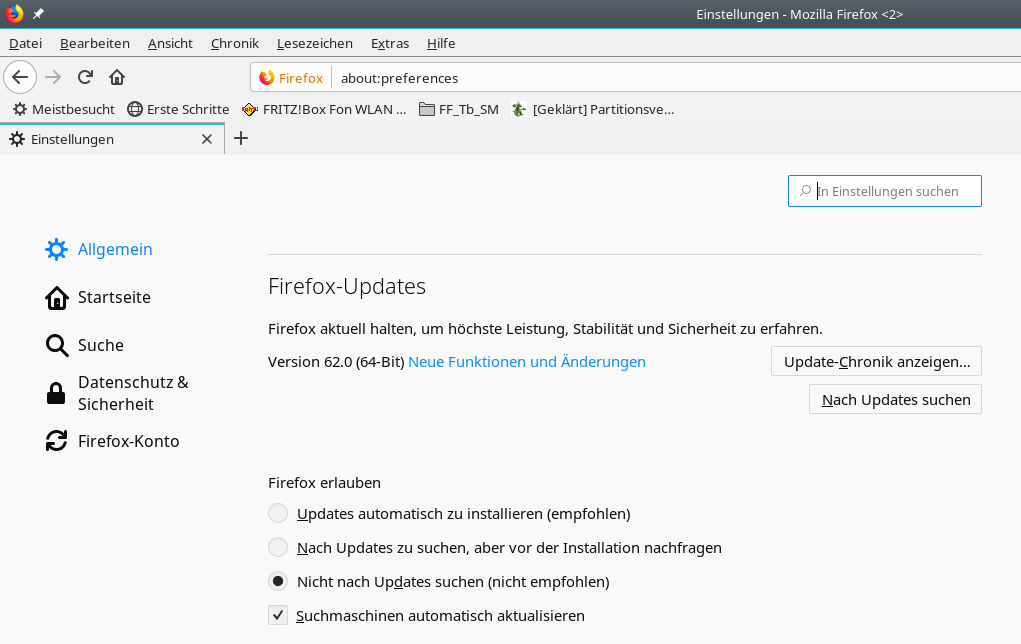 Aufgrund dieses zwischen Dir und brick streitig geführten Fadens habe ich heute die Distributionsversion von openSUSE 15 Leap von Firefox Quantum 60.2.0-ESR auf Firefox Quantum 62.0 aktualisiert. In meinem Fall via