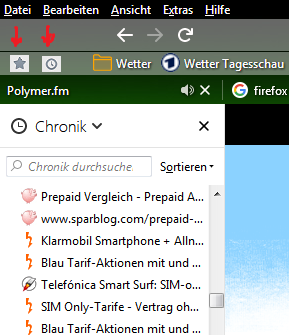 Früher war es möglich, die Anzeige der Sidebar elegant mittels zweier Schaltflächen in der Lesezeichen-Symbolleiste mit einem Klick von "Chronik" auf "Lesezeichen" umzustellen. (siehe Grafik > rote Pfeile). Ist dieses Feature wiederherstellbar?
