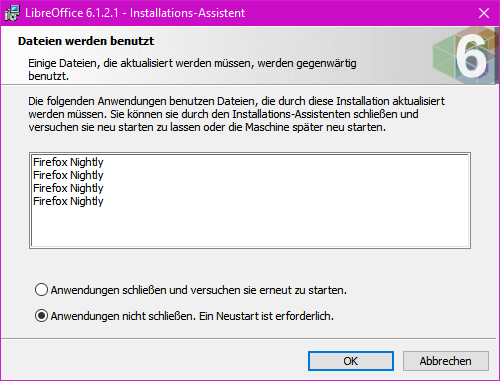 mir ist eben mal aufgefallen, dass Libre Office bei der Installation einen Hinweis bringt, dass Firefox geschlossen werden muss, weil Firefox (zur Zeit) Dateien nutzt die durch Libre Office aktualisiert werden sollen. Der im Screenshot angemerkte Firefox Nightly ist aber kein Firefox der bei mir über Windows installiert ist, sondern nur als entpacke Zip-Version abseits der Systempartition läuft. Daher nun die Frage, was für Dateien dies sein sollen? Leider benennt der Libre Office Installer diese Dateien nicht.