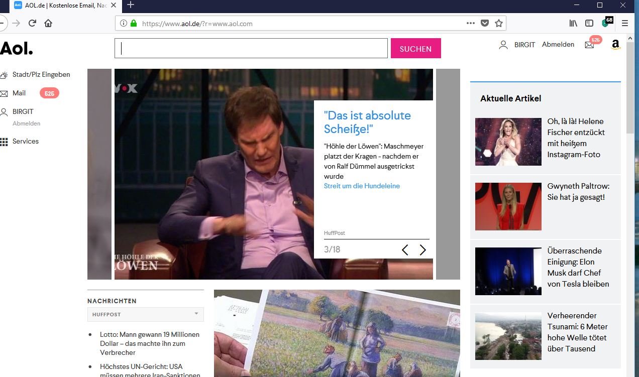 ich beschreibe kurz, wie ICH zu aol gelange: klicke firefox an und gebe in die suchleiste(google) ein : aol login. dies klicke ich an... und kann mich normal bei aol anmelden. wenn ich aber die mails anklicke (siehe screenshoots) öffnet sich dann kein fenster..es tut sich nix. also, alles hat immer bis vor ca 1 woche funktioniert!. heute habe ich cache daten gelöscht und es ging trotzdem nicht. dann habe ich heute firefox deinstalliert und neuinstalliert... geht trotzdem nicht. aol support antwortete sogar vorhin und schlug vor cache löschen..... oder inkognito modus benutzen oder einen anderen browser benutzen :roll: ... Hat aber alles keinen erfolg gebracht und einen anderen browser möchte ich eben n i c h t benutzen. ... ?? mfgruß B. -