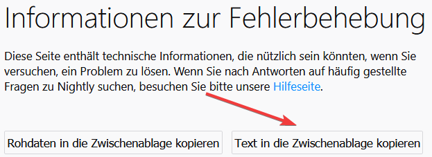 • :arrow: Bitte folgende Infos liefern: Unter Hilfe => Informationen zur Fehlerbehebung kopierst du den Inhalt des Feldes durch Drücken des Buttons