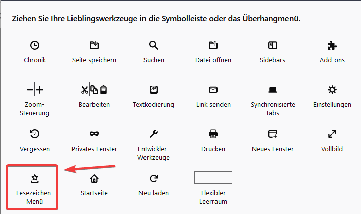 ich hätte gern ein Icon, mit dem ich direkt auf die Lesezeichen zugreifen kann (nicht auf das Lesezeichen-Menü), und zwar in der Zeile, in der das Adressfeld ist. Ich möchte keine ganze Zeile für Lesezeichen spendieren.