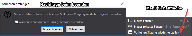 Seit dem Update auf Firefox 63.0 zeigt browser.showQuitWarning;true keine Wirkung mehr; die Warnung "Tabs speichern und beenden" wird nicht mehr angezeigt. Auch die Option "Fenster und Tabs der letzten Sitzung anzeigen" ist nicht mehr verfügbar. ![]()