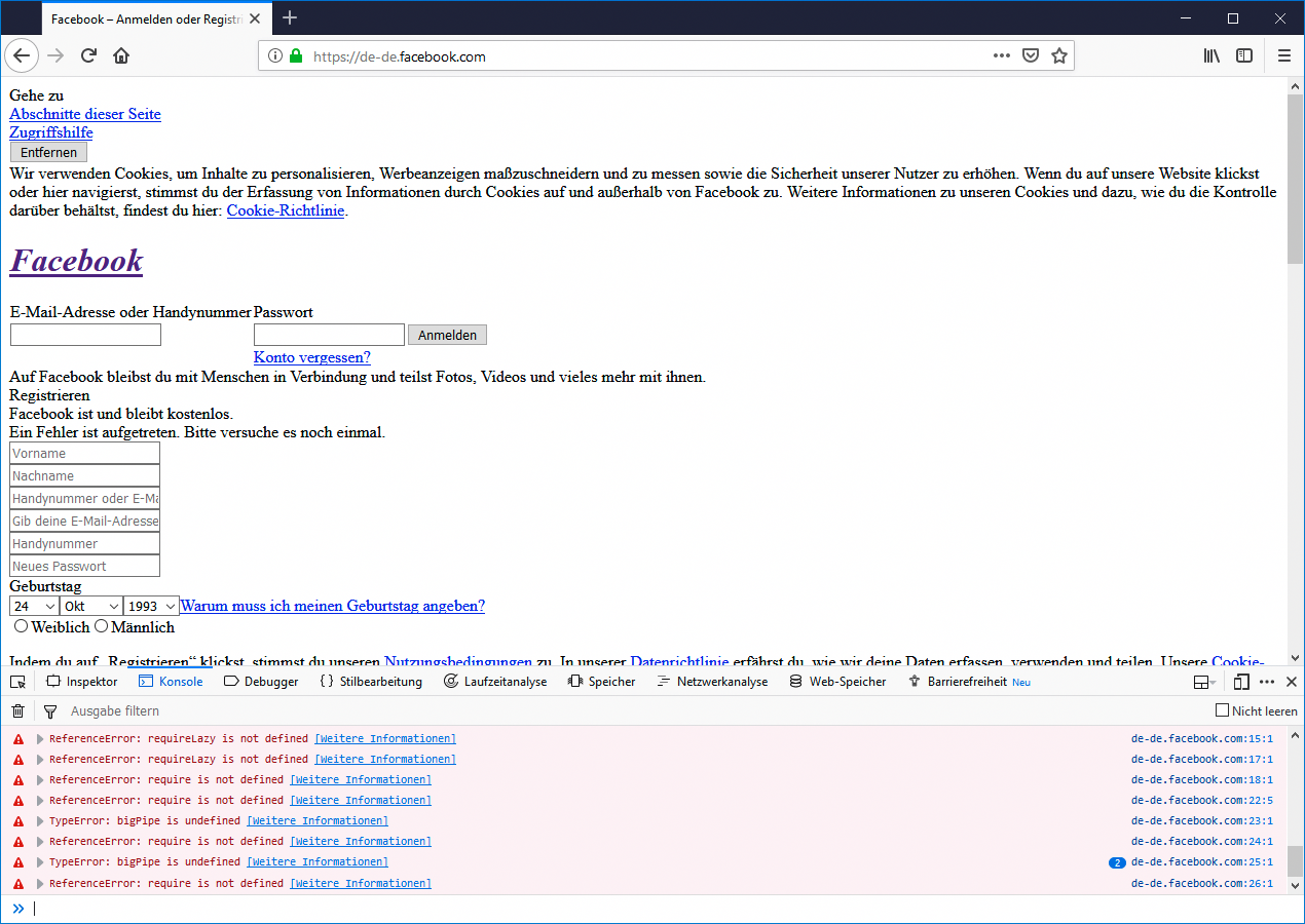 Alle anderen PCs im LAN zeigen diese Probleme nicht. Mir ist auch aufgefallen, dass wenn ich die Entwicklertools (F12) auf dem betroffenen PC öffne, sobald Facebook lädt, ich eine Reihe von Fehlern angezeigt bekommen, die ich auf einem anderen PC unter FF x64 nicht sehe ,siehe Screenshot unten. Seltsam ist dabei, dass sich die Entwicklertools zwischen der x32 und der x64 Variante unterscheiden, weiß nicht ob dies relevant ist.