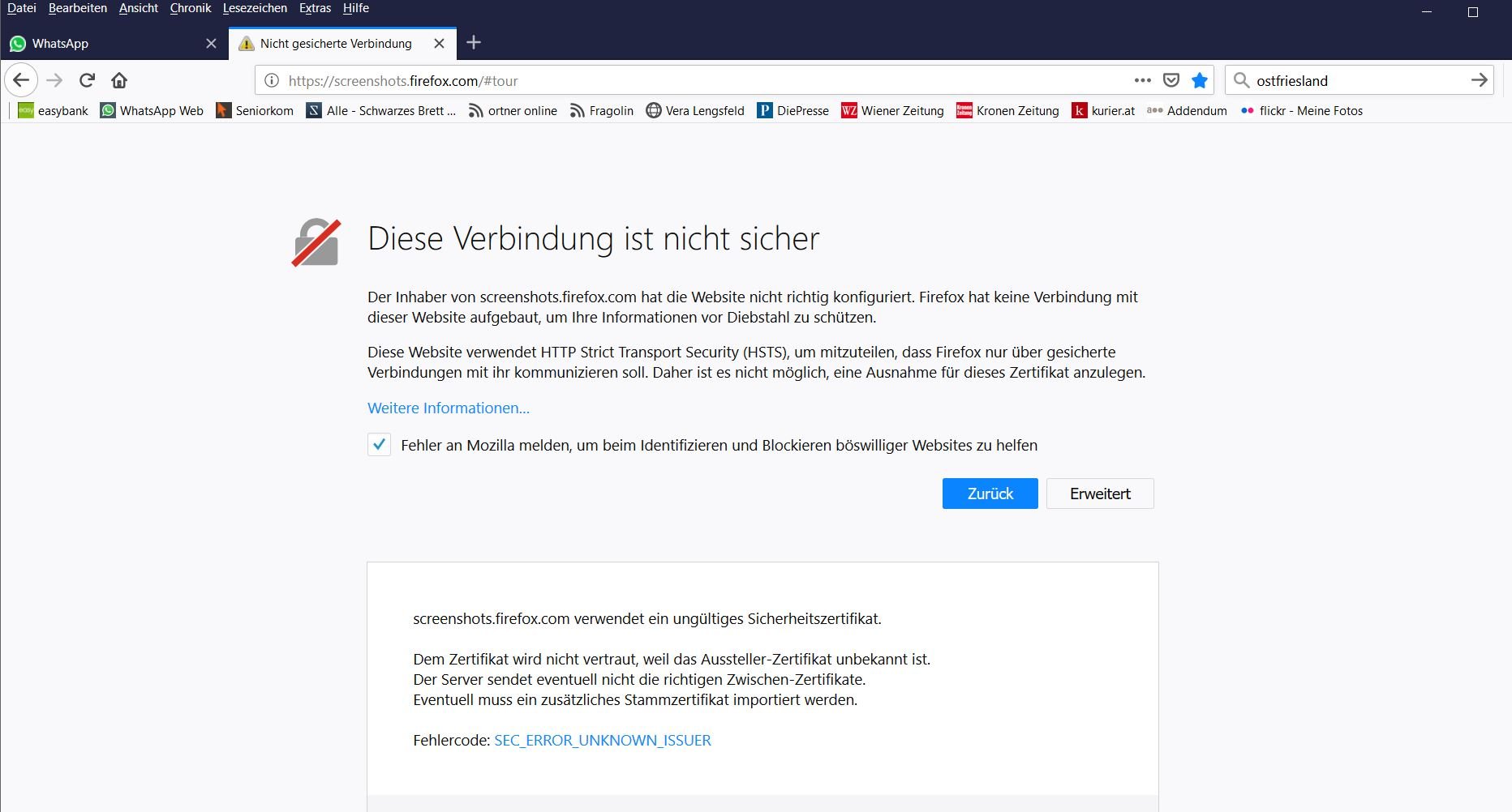 Also auf den blauen SEC_ERROR_UNKNOWN_ISSUER Fehlercode klicken, dann auf den Button um den gesamten Text zu kopieren und füge das in die nächste Antwort als Code hier ins Forum ein . -