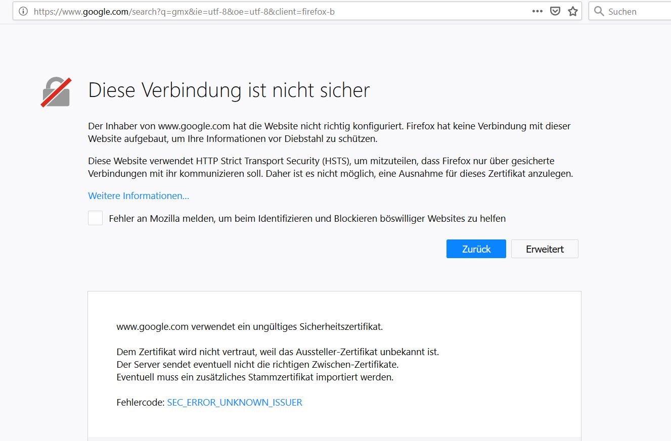 Ganz krass ist, dass ich bei JEDER https Website eine Sicherheitswarnung bekomme, selbst bei solchen, die ich seit Jahren unter meinen Favoriten habe und die ich täglich aufgerufen habe. Bei manchen kann ich trotz Klick auf Erweitert keine Freischaltung vornehmen. Die google Suche zum Beispiel !!! Anbei einige Screenshoots...