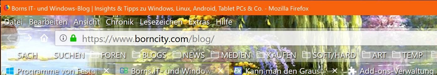 • Der aktivie Tab sowie die darunterliegenden Leisten (mit den Icons bzw. Bookmarks) werden mit einem grauen (milchigen) Schleier angezeigt, was zumindest für mein Empfinden einfach nur grottig aussieht. Beim aktiven Tab kann ich den Sinn ja noch verstehen, wobei auch ich hier lieber hätte, wenn dies zum Beispiel durch eine Änderung der Farbe in der Tabbeschriftung dargestellt werden würde. Die Eingrauung der darunterliegenden Zeilen will ich aber definitiv nicht haben. Man sieht das an folgendem Screenshot: