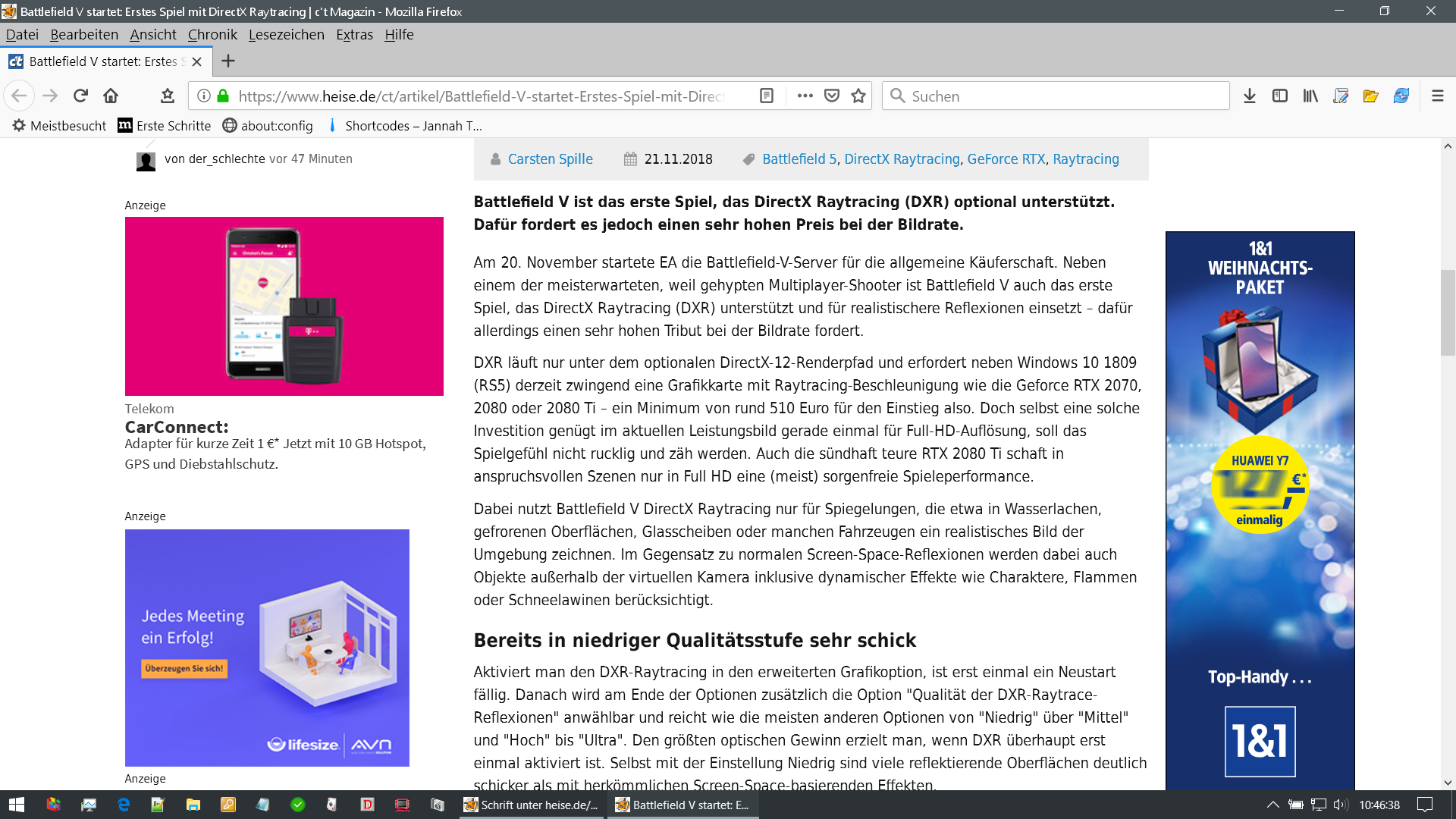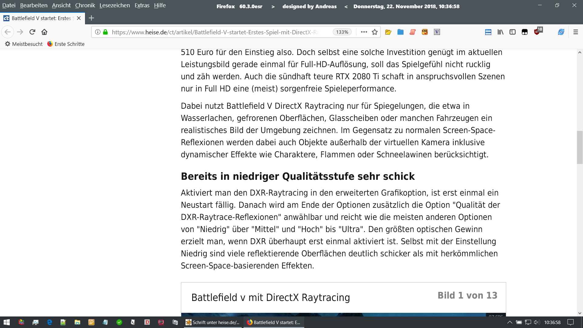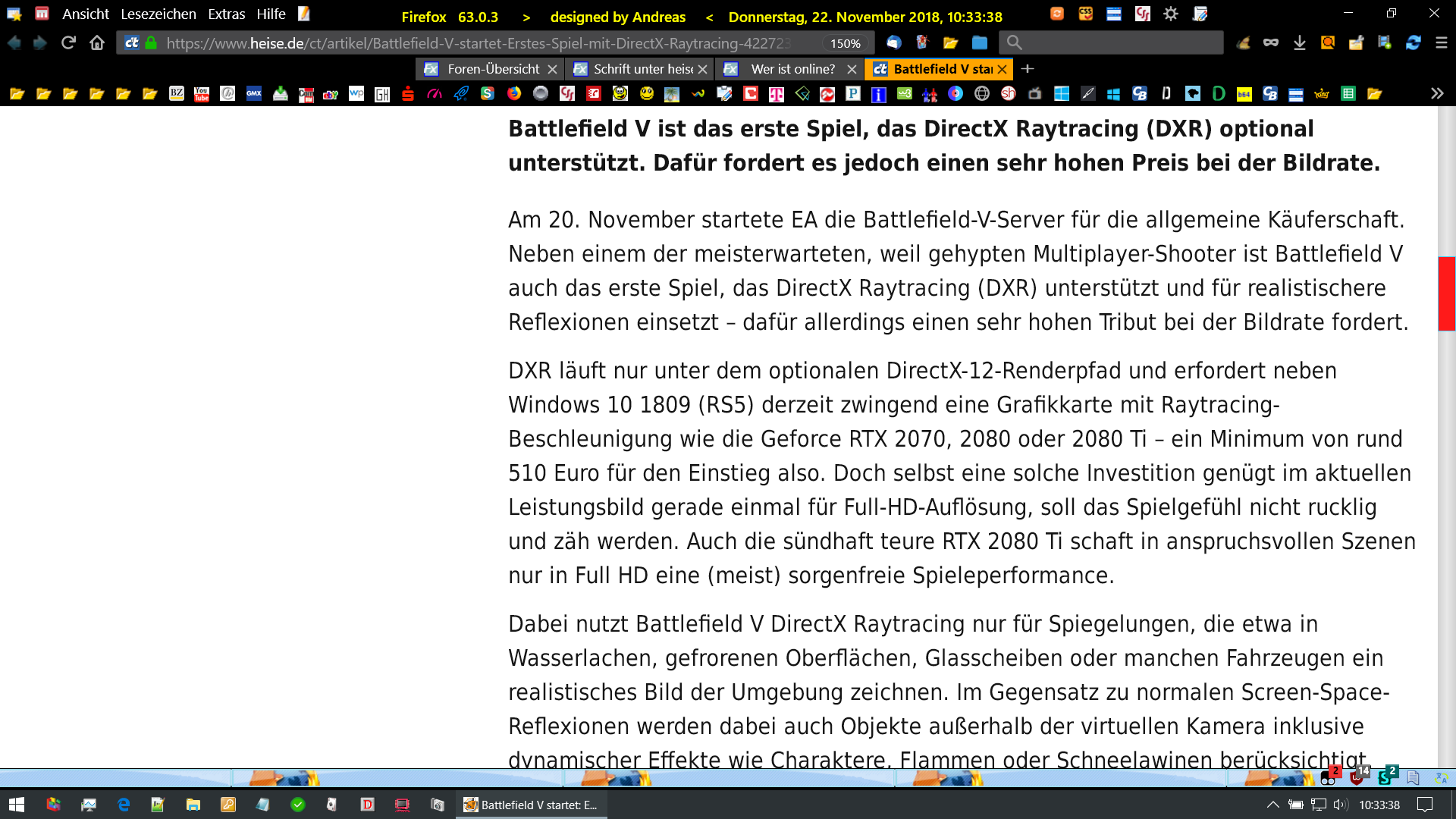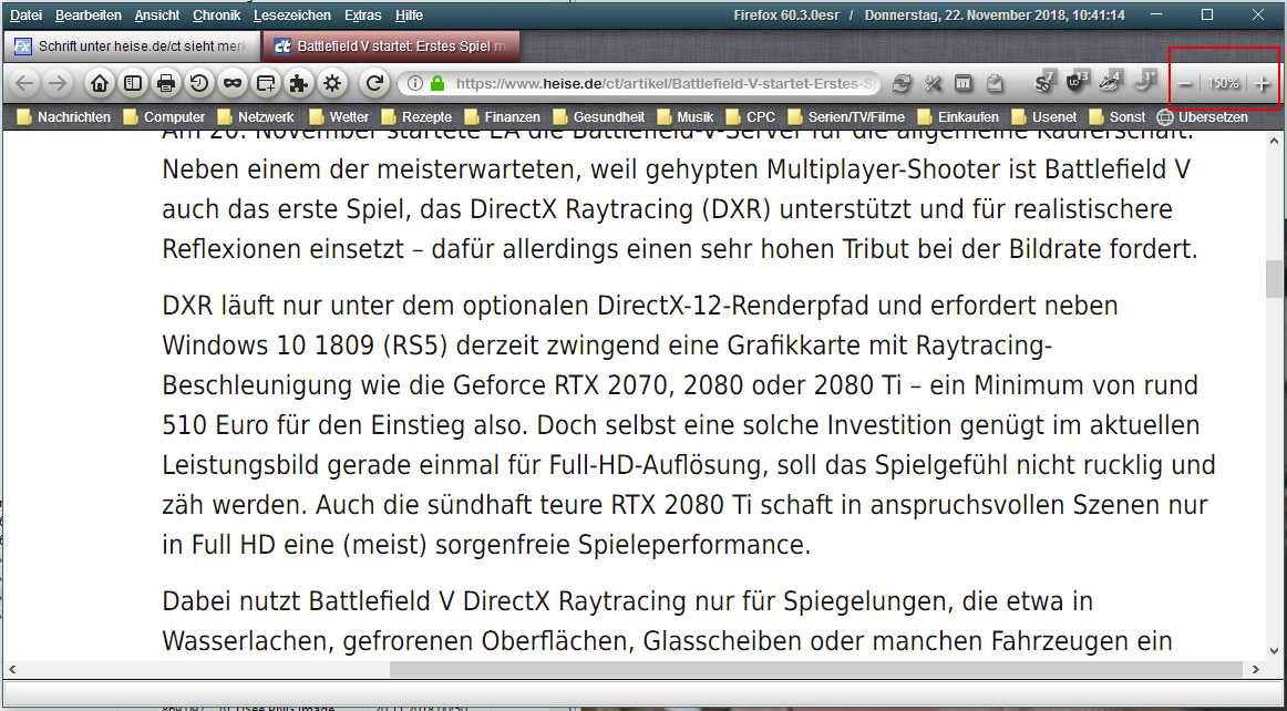 die Schrift, welche bei der c't für den Artikeltext verwendet wird, hat bei allen getesteten FireFox Versionen (u.a. ESR/Nightly) eine sehr ungleichmäßiges Aussehen. Etliche Buchstaben haben am oberen Rand eine Art 'Verdickung', die sehr merkwürdig aussieht. Edge zeigt exakt das gleiche Verhalten wie der Firefox.