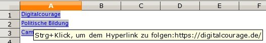 Jetzt eine neue Excel-Datei (als Anhang beigefügt XLS -> ZIP) angelegt, Zelle A1 = "Digitalcourage" und die URL mit CTRL-K https://digitalcourage.de/ eingefügt. Anklicken des Links bringt die Meldung "... konnte nicht geöffnet werden. Die angeforderten Informationen konnten nicht gedownloadet werden." (Sorry für den misslungenen sprachlichen Ausdruck, nicht von mir sondern Original-Meldung ...)