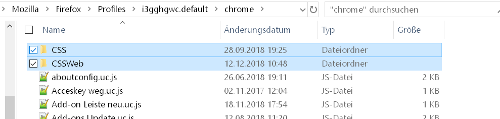 Nein ich habe die einzelnen css, wie du, in einem css-Ordner. Aufgerufen werden diese Dateien durch die userChrome.css, die nur noch die "Wegweiser" enthält.