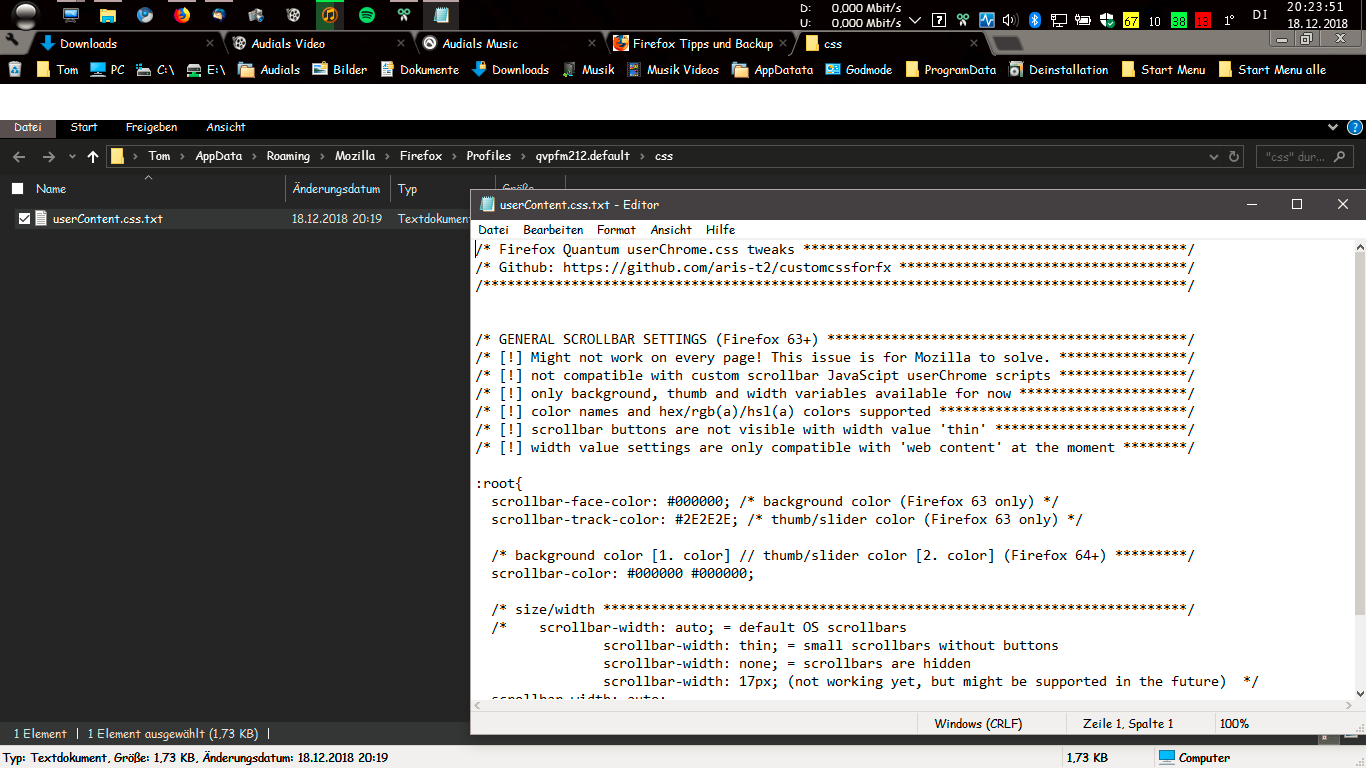 Auch sehe ich, dass du die userContent.css Datei im falschen Verzeichnis erstellt hast. Diese muss, wie ich schon vorgängig erwähnt hatte, in einem Verzeichnis namens chrome erstellt werden (nicht ein Ordner mit dem Namen css.)