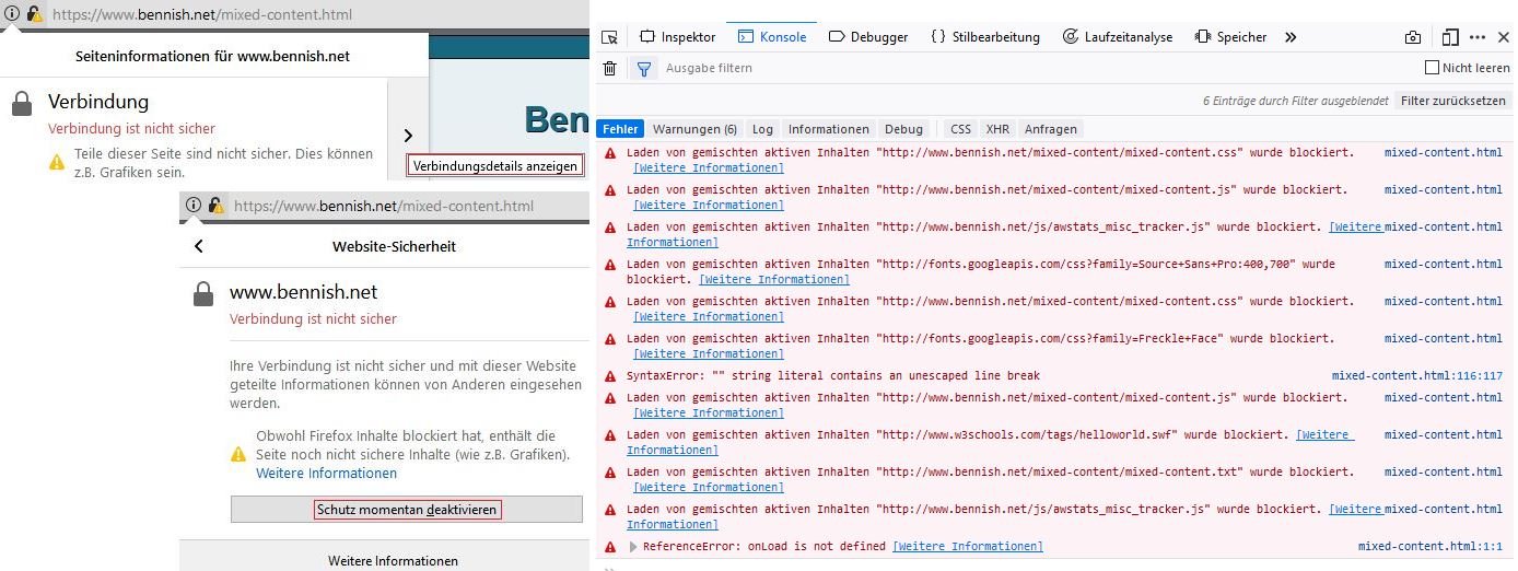 15. Januar 2019 um 07:34 #2 Auf beide Fragen kann ich mit einem "JA" Anworten. Mehr dazu: Blockierung gemischter Inhalte in Firefox | Hilfe zu FirefoxBeispiel Website -> Mixed content test page (https content including http content) - Bennish.netMozilla/5.0 (Windows NT 10.0; Win64; x64; rv:64.0) Gecko/20100101 Firefox/64.0 / Gruß, der_nachdenklicher