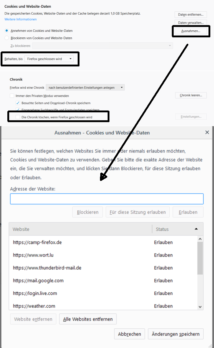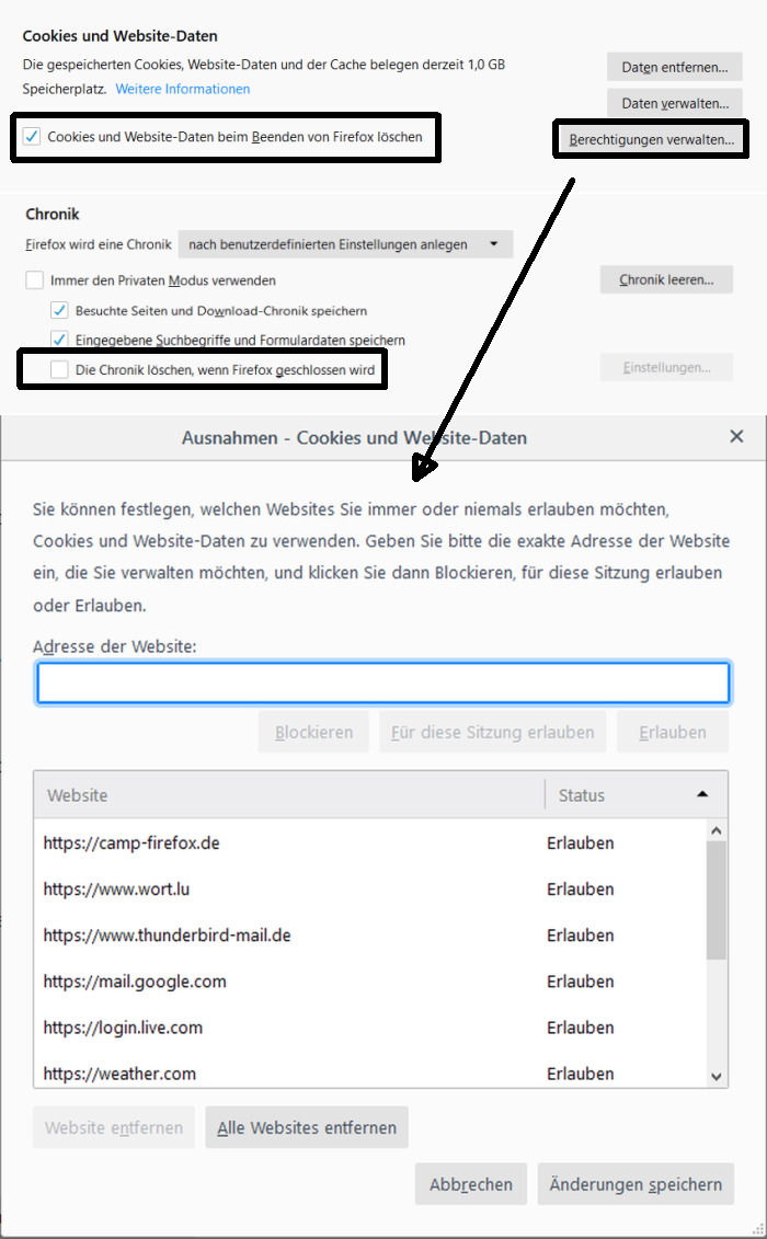 • das Häkchen bei Cookies und Website-Daten beim Beenden von Firefox löschen setze, werden die Cookies von Gmail, Google Drive und One Drive gelöscht, obwohl sie in der Ausnahmeliste sind und eigentlich erhalten bleiben müssten