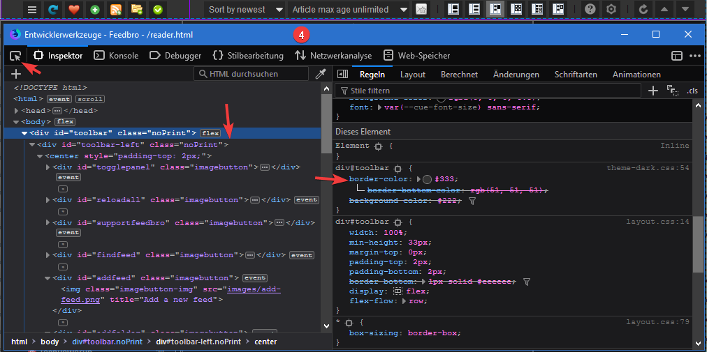 Mit dem Zieldokumentauswähler lässt sich beispielsweise direkt das gewünschte Iframe auswählen, welches man gerne inspizieren möchte. (hier der Feedreader selbst --> siehe Screenshot 3), damit man dann später mittels des Inspektors jedes Element des Feedreader selbst frei inspizieren kann wie auch CSS-Regeln direkt temporär abändern kann. (siehe Screenshot 4) Innerhalb des Reiters Stilbearbeitung kann dann noch jede verwendete CSS-Datei begutachtet werden.