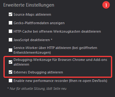 Mittels den Entwicklerwerkzeugen/Browser-Werkzeuge von Firefox. Voraussetzung dafür ist, dass in den Einstellungen von den Entwicklerwerkzeugen (Strg+Umsch+I -> Dreipunktemenü -> Einstellungen) die Optionen "Debugging Werkzeuge für Browser-Chrome und Add-ons aktivieren" und "Externes Debugging aktivieren" aktiv hast. (siehe Screenshot 1)