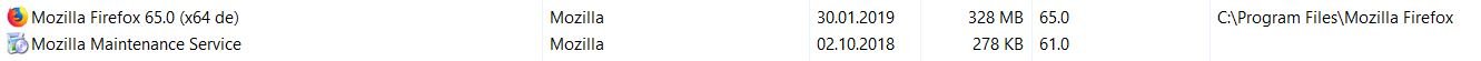 Was mir aber aufgefallen ist, ist die Tatsache, dass in der Systemsteuerung nur die Versionsnummer des Mozilla Firefox (x64 de) aktualisiert wird. Der Mozilla Maintenance Service behält dagegen immer die alte Versionsnummer bei. Im Zielverzeichnis "C:\Program Files (x86)\Mozilla Maintenance Service" wird die Version aber trotzdem aktualisiert. Ich aktualisiere dann immer die Versionsnummer händisch in der Registry. An sich stört mich das nicht sehr, aber ich frage mich, ob andere Ähnliches bei sich festgestellt haben. Zumindest im englischsprachigen Forum habe ich einen ähnlichen Fall gefunden: https://support.mozilla.org/de/questions/1234880