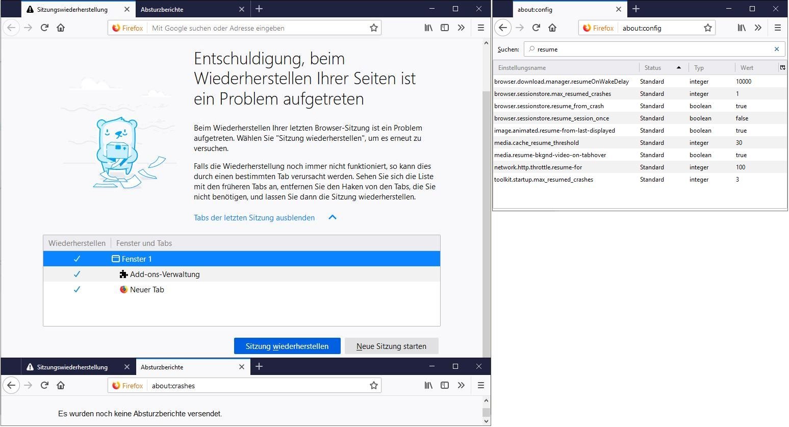 Mein Firefox ist so eingestellt, dass er beim Start die vorherige Sitzung wiederherstellt.