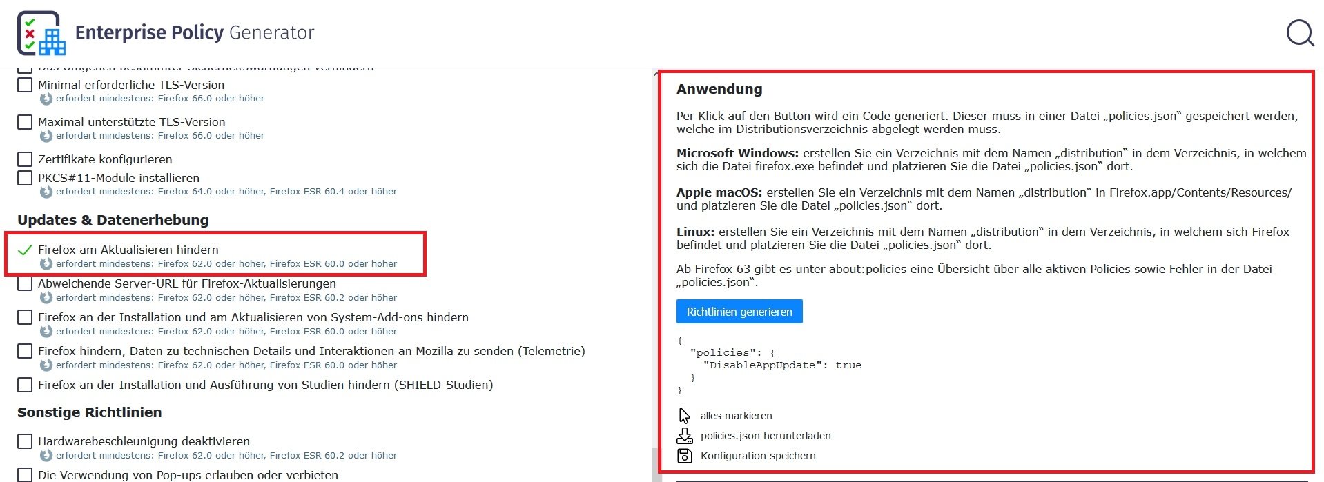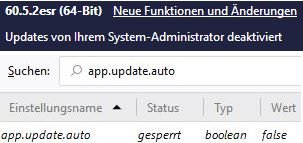 Unter about:config ist app.update.auto ebenfalls gesperrt.