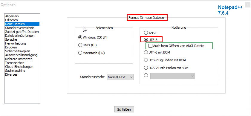 WENN in den Einstellungen der Haken bei "Auch beim Öffnen von ANSI Dateien" (grün umrandet) GESETZT ist (default Einstellung) steht unter Kodierung das Format "UTF-8 ohne BOM"Öffne ich die gleiche Datei mit Notepad++7.6.4 steht unter Kodierung das Format "ANSI" WENN VORHER in den Einstellungen der Haken bei "Auch beim Öffnen von ANSI Dateien" (grün umrandet) NICHT gesetzt ist.