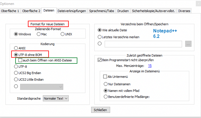 [attachment=0]np-7.6.4.png[/attachment]Erstelle ich mit Notepad++ 6.2 eine neue Datei im Format "UTF-8 ohne BOM" OHNE Umlaut drin und speichere sie ab und öffne sie erneut in Notepad++ 6.2 steht unter Kodierung das Format "ANSI" WENN VORHER in den Einstellungen der Haken bei "Auch beim Öffnen von ANSI Dateien" (grün umrandet) NICHT gesetzt ist.