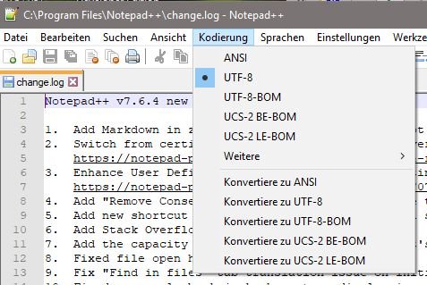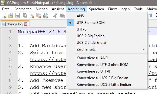 Notepad-6.2.pngIn Version 7.6.4 (und auch früher) heißt der Punkt jetzt UTF-8-BOM
