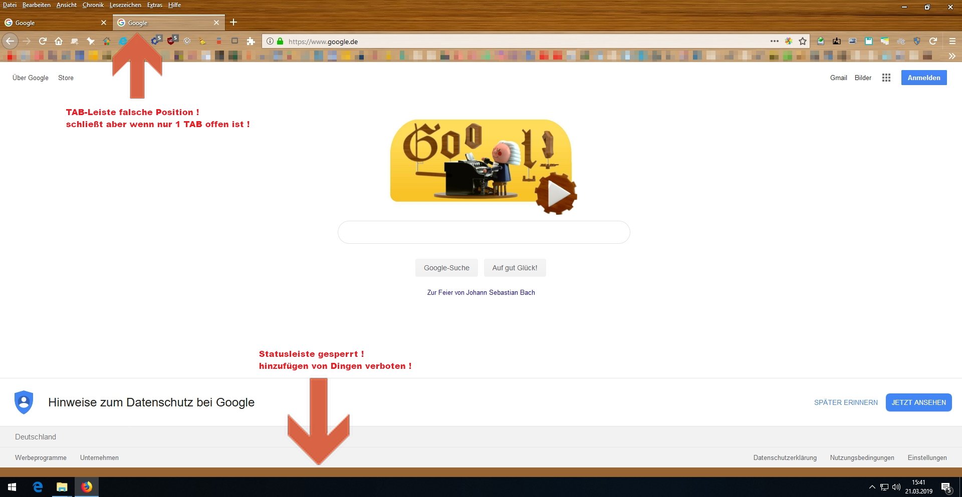 Ich brauch bitte dringend einmal eure Hilfe, denn ich bekomme meinen Firefox einfahc nicht wieder so hin, wie er im FF 64 war. Vieles habe ich bereits versucht, doch irgendwie ist da echt der Wurm drinn und ich bin am verzweifeln.