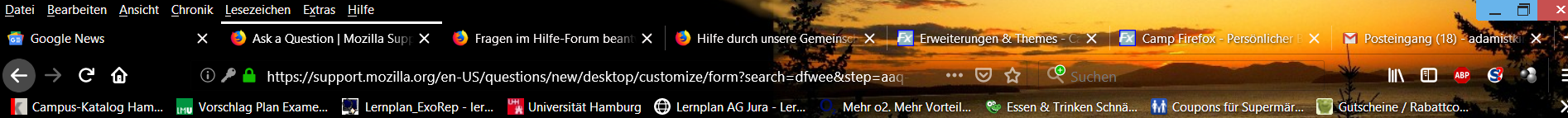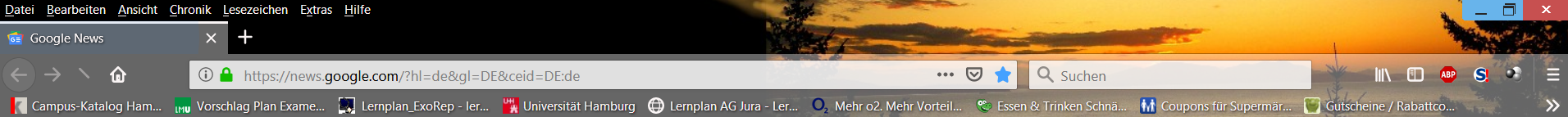 seit 2 tagen habe ich ein problem mit firefox bzw. meinem firefox-thema. Ich habe dieses Thema mehr als 1 Jahr verwendet und seitdem nichts geändert. Weder Firefox-Einstellungen noch Themensachen. Seit 2 Tagen nach dem Öffnen von Firefox werden der Hintergrund des Suchfelds und das URL-Feld nach etwa zehn Minuten mit Firefox plötzlich transparent. Wenn ich Firefox schließe und wieder öffne, ist alles wieder normal. und nach etwa 10 Minuten passiert dasselbe. Wie kann ich dieses Problem beheben?