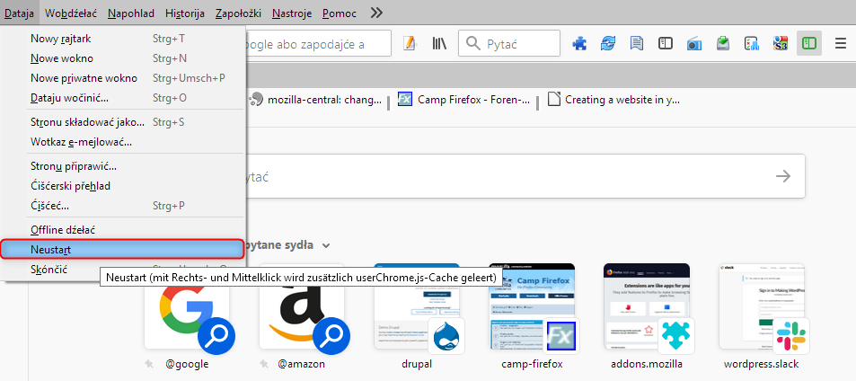 Außerdem gibt es noch das Skript Restart-PanelButton.uc.js, dass einen Neustart-Eintrag im Hamburger-Menü erzeugt.