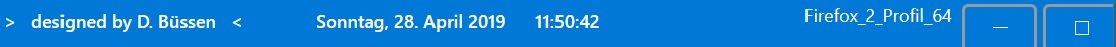 Alles anzeigen(function() { function doDatClock() { var timestr = new Date().toLocaleDateString( locale , options ); const blanks = ' '; let i = timestr.lastIndexOf(','); timestr = timestr.substring(0,i) + blanks + timestr.substring(i+1); if( count == 1 ) { var counter = new Date( 1000 * sec ).toISOString().substr( 11 , 8 ); // .replace(/^[0:]+/, '') // if you want to replace zeroes and colons timestr = timestr + ' (' + counter + ')'; sec++; } ClockLabel.setAttribute( 'value', timestr ); } var count = 0; // if you don't want a counter set this to zero var agent = 1; // if you just want the clock set this to zero var language = 'de-DE'; // locale, e.g. 'de-DE' , 'en-US' , 'fr-FR' var personalText = ' > designed by D.Büssen <'; // your personal text here var cssColor = 'white'; // Font Color var css = 'padding-top: 4px !important; padding-left: 0px; color: ' + cssColor + '; font-weight: 600; text-shadow: none; width: 275px; margin-right:42px;'; var cssA = 'margin-left:68px; width: auto;'; var options = { weekday: 'long', year: 'numeric', month: 'long', day: 'numeric', hour: '2-digit', minute: '2-digit', second: '2-digit' }; var sec = 0; var locale = language || window.navigator.languages[0]; var position = document.getElementById('helpMenu'); var ClockLabel = document.createElement('label'); ClockLabel.setAttribute('id', 'statusbar-clock-display'); ClockLabel.setAttribute('class', 'statusbarpanel-text'); ClockLabel.setAttribute('style', css); position.parentNode.insertBefore(ClockLabel, position.nextSibling); if( agent == 1 ) { var AgentLabel = document.createElement('label'); AgentLabel.setAttribute('id', 'statusbar-agent-display'); AgentLabel.setAttribute('class', 'statusbarpanel-text'); AgentLabel.setAttribute('style', css + cssA); var FFstr = window.navigator.userAgent.split(' '); var FF = FFstr[FFstr.length-1].replace( '/' , ' ' ); // var text = "Firefox " + gAppInfo.version + personalText; // Cc["@mozilla.org/xre/app-info;1"].getService(Ci.nsIXULAppInfo).QueryInterface(Ci.nsIXULRuntime); var text = "Firefox " + AppConstants.MOZ_APP_VERSION_DISPLAY + personalText; AgentLabel.setAttribute( 'value', text ); position.parentNode.insertBefore(AgentLabel, position.nextSibling); } if( count == 1 ) { ClockLabel.addEventListener('dblclick', function() { sec = 0; }); } window.setInterval( doDatClock , 1000 ); })(); -