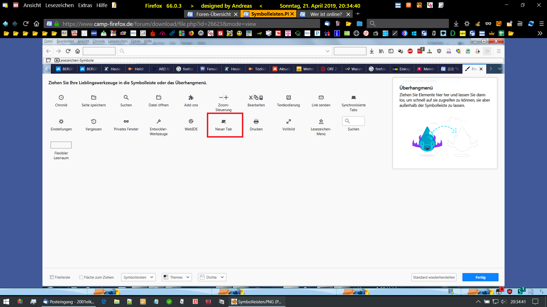 [attachment=0]Symbolleisten.PNG[/attachment]Danke für Eure Bemühungen, bei mir ist im angegenenen Menü keine Schaltfläche für 'Neuer Tab' aufgeführt.