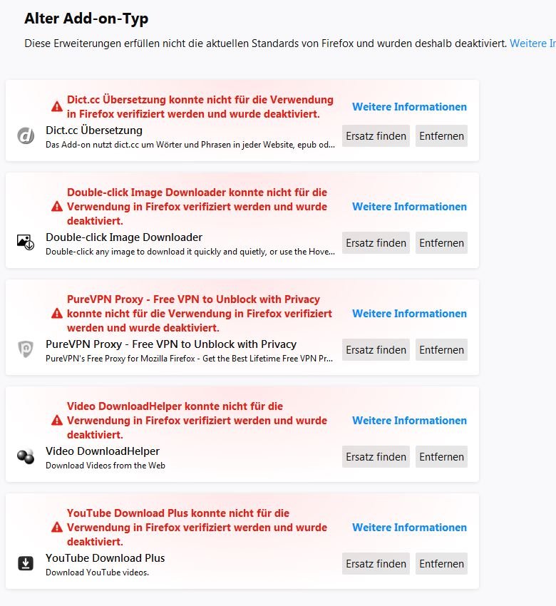4. Mai 2019 um 10:08 #1 Auch in anderen Foren kocht es:Der FireFox hat eigenmöchtig alle Add On's rausgeschmissen und als nicht verifiziert gemeldet.Hat jemand Infos was da abgeht?Gruß[attachment=0]FireFoxAddOnS.JPG[/attachment]