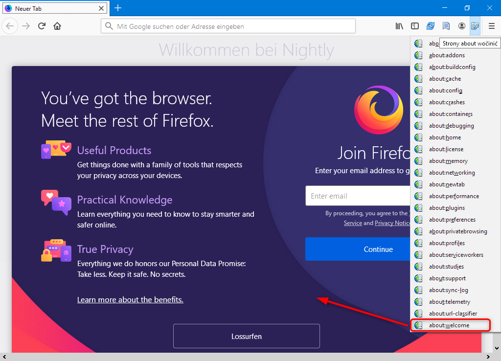 Ab dem 68er Nightly gibt es eine neue about:-Seite: about:welcome. Es handelt sich um eine Willkommensseite, die als Ebene über der New-Tab-Seite erscheint, das heißt im gleichen Tab. Darunter wird noch in der Neuer-Tab-Seite zugehöriger Inhalt angezeigt. Beide haben ein Schließen-Kreuz, sodass sie beendet werden können, ohne dass auch der Neuer-Tab-Tab