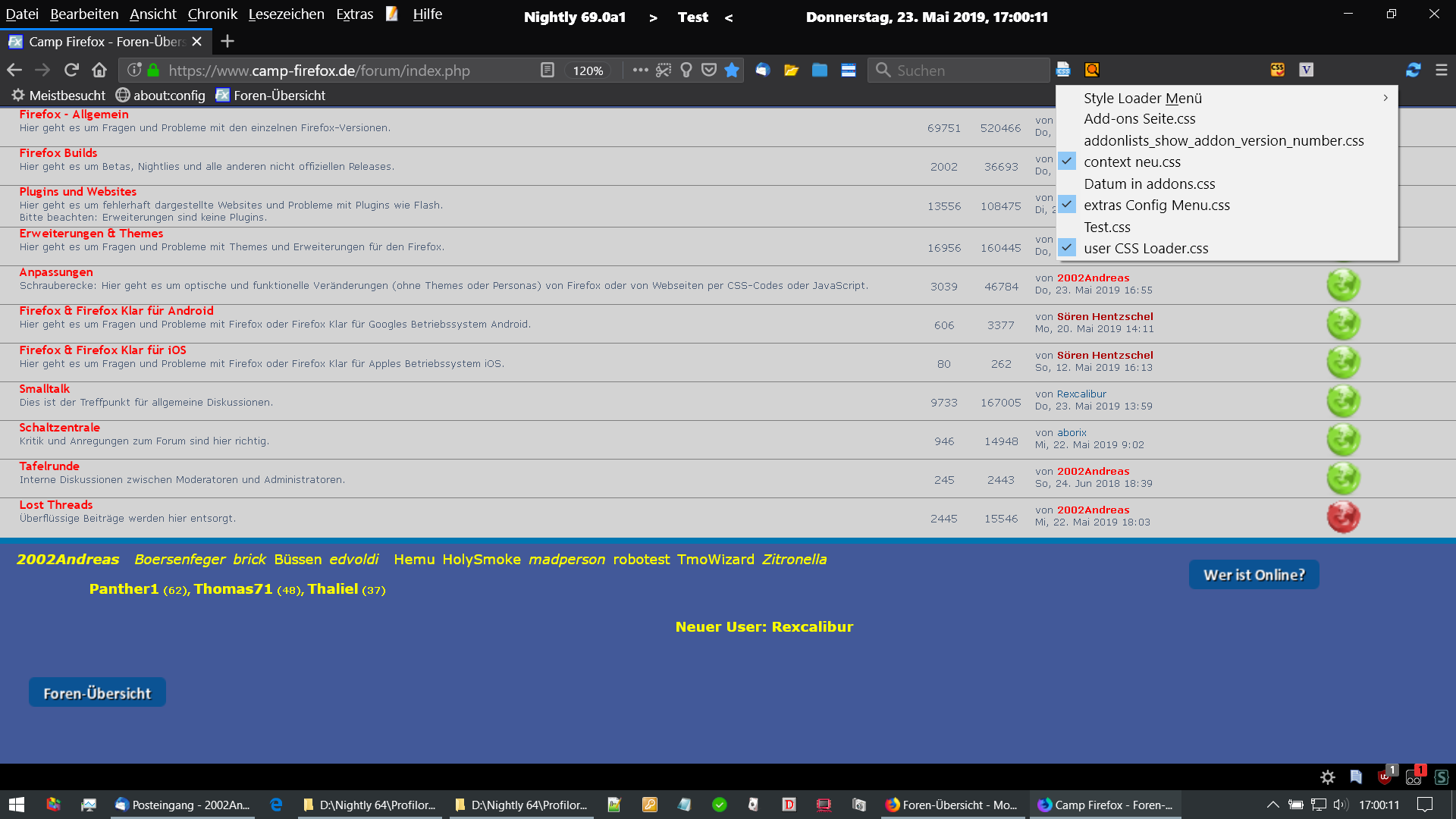 • Hast du in der Wetterfuchsbutton.css oben browser.xul in browser.xhtml geändert? Wenn nicht, tue das. Ich habe gerade gesehen, dass das Wetterfuchs-Symbol dann immer noch im Anpassen-Fenster ist. Ziehe es also dort heraus und irgendwo hin.