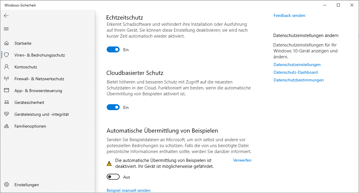 • "Automatische Übermittlung von Beispielen" aktiviert?