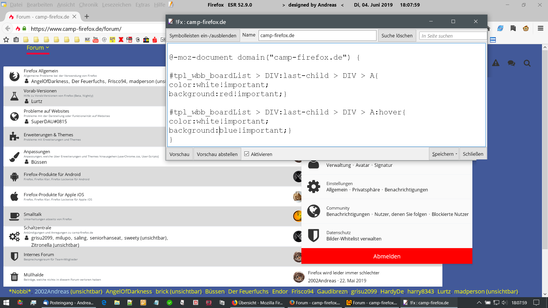 Ich nutze den Code in der userContent.css, und er funktioniert in verschiedenen Profilen einwandfrei.