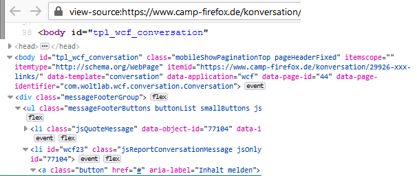 Jetzt habe ich wieder etwas dazu gelernt, wenn ich weiter nach oben scrolle, komme ich auch dort hin. Das habe ich nie beachtet, sondern immer gleich im markierten Bereich gesucht, und da bin ich dann auch immer hier gelandet .messageFooterGroup .jsReportConversationMessage. Danke! ![]()
