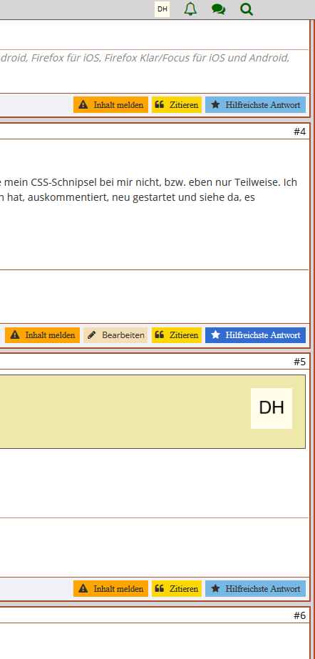 CSS.messageFooterButtons a.button[data-tooltip="Zitieren"] { background: #44f !important; } .messageFooterButtons a.button[data-tooltip="Als „Hilfreichste Antwort“ markieren"] { background: gold !important; }Gültig ist wie vorher aufgeschrieben der Code zum a.button.