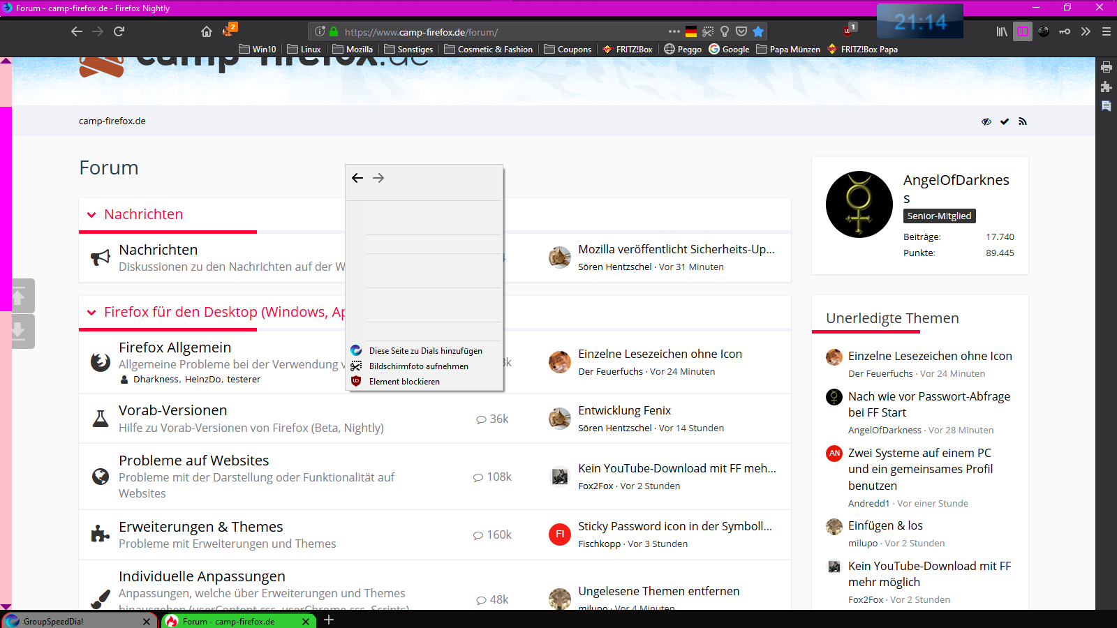 ich habe da ein ähnliches Problem und zwar sind bei mir keine firefoxeigenen Einträge im Kontextmenü mehr vorhanden