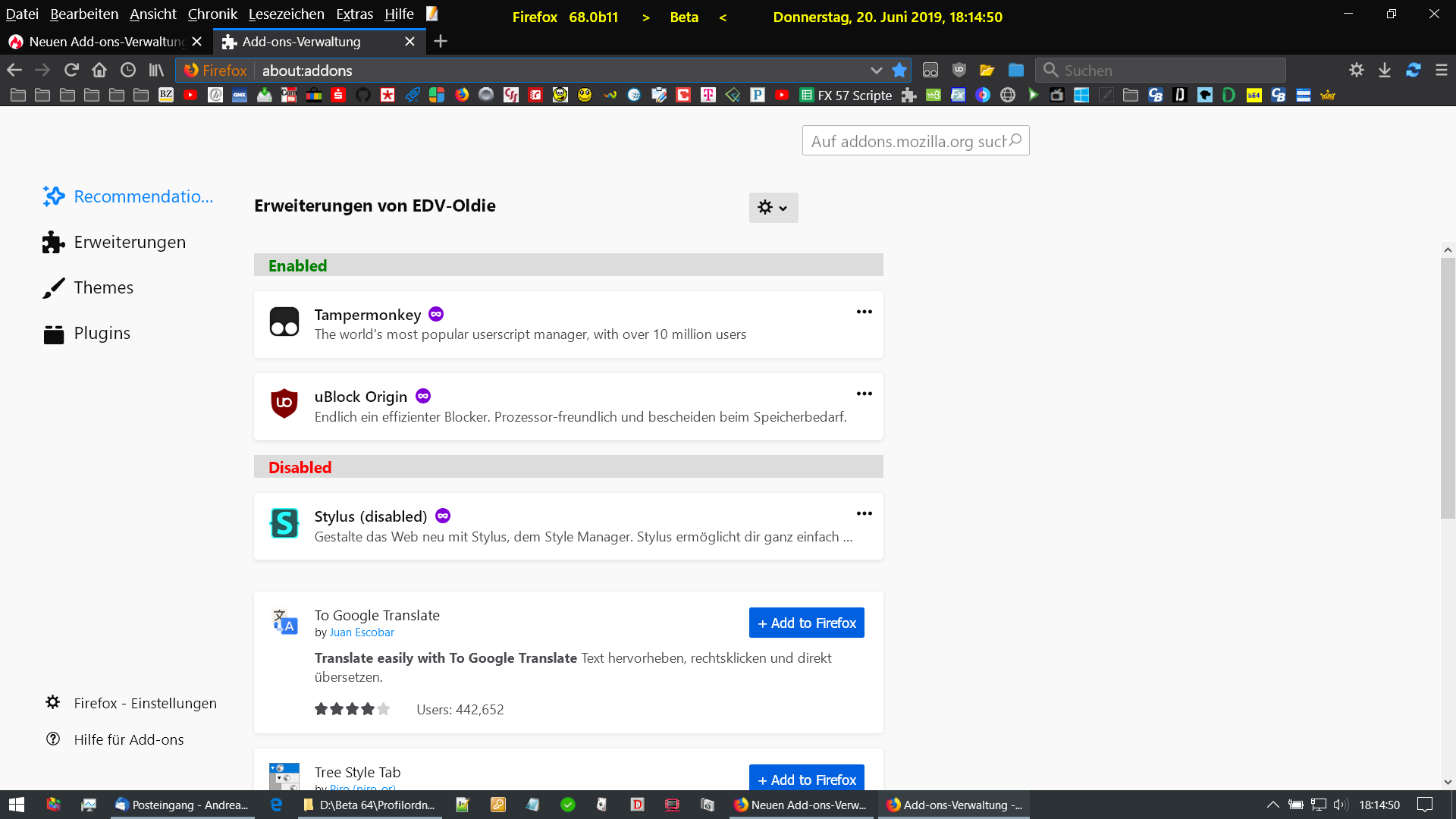 ich habe da ein kleines Problem mit der neuen Add-ons-Verwaltung unter 68.0b11.
