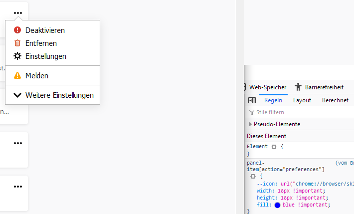 Diese zusätzliche Regel gewährleistet, dass -moz-context-properties: und fill: ohne Ausnahme allen panel-item-Einträgen zugewiesen werden.