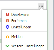 Ich habe mal in den omni.ja geforscht. Die Symbole für Einstellungen und Weitere Einstellungen sind original schwarz. Das Symbol für Deaktivieren ist original rot. Für Entfernen, Melden und Aktualisieren hat Endor keine Symbole angegeben, Aktualisieren, weiß ich nicht, der Eintrag erscheint ja nur nach einer Aktualisierungsprüfung, gibt es sowieso Symbole. Die habe ich jetzt noch nicht herausgesucht. Mal sehen, ob die original schwarz oder farbig sind.