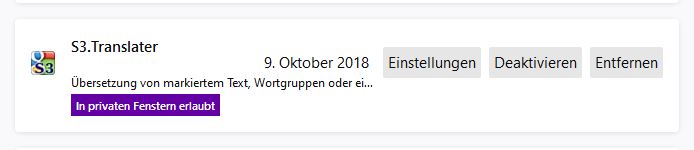 Danke für den Hinweis. Habe S3 Entfernt. Habe "Simple Translate" getestet und bin sehr zufrieden damit. In Verbindung mit "QTranslate" wo man sehr einfach einzelne Wörter und ganze Texte (man kann sich das ganze auch vorlesen lassen) auch außerhalb von FF Übersetzen kann ist das eine Optimale Lösung zumindest für mich.