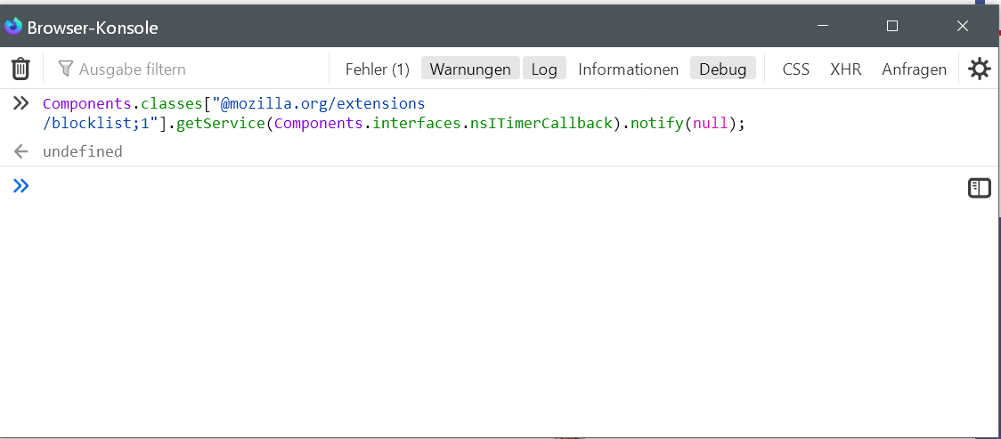 CodeComponents.classes["@mozilla.org/extensions/blocklist;1"].getService(Components.interfaces.nsITimerCallback).notify(null);und mit der Enter Taste abschicken. Danach kontrollieren ob danach deine blocklist.xml aktualisiert wurde.