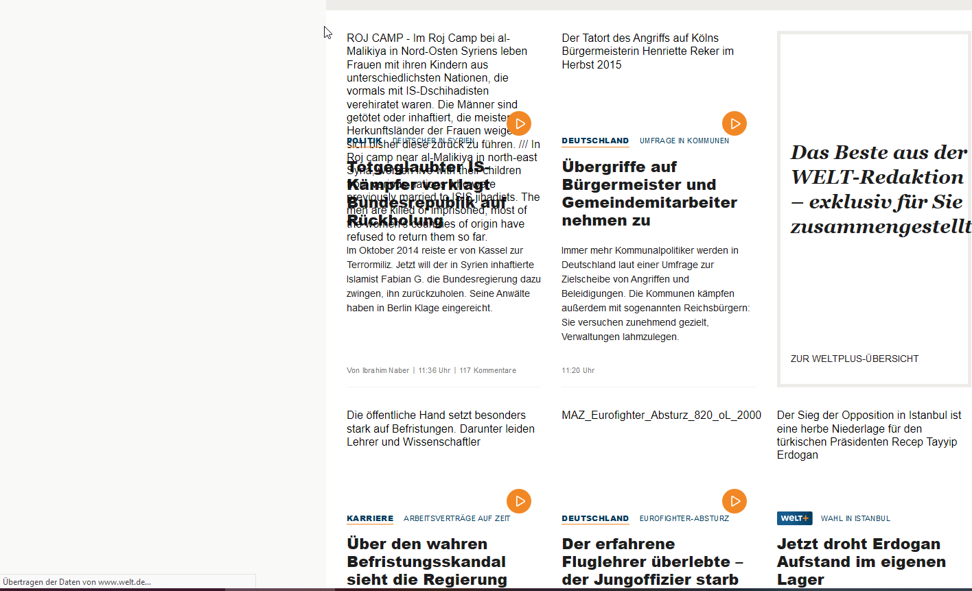 Relativ zuverlässig kann man das Problem auf welt.de beobachten. Wenn ich dort die Startseite lade, kommt es häufig vor, dass in der Statusleiste "Daten werden übertragen von" sehr lange steht und nicht alle Bilder geladen werden. Das sieht dann so aus wie im Bild im Anhang.![]()